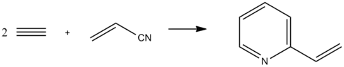 An alternative synthesis involves the reaction of acrylonitrile and acetylene below 130–140 ̊C in the presence of organocobalt compounds as a catalyst.[1] Acrylonitrile is the solvent for the reaction.[2]