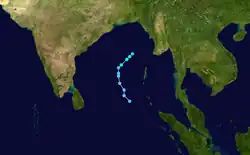 Toward the end of March, an area of convection increased over the southern Bay of Bengal from an active equatorial trough. The system progressed northward,[4] with a weak center between Sri Lanka and Sumatra by March 25.[5] On March 27, a low-pressure area developed, which the IMD designated as a depression by 12:00 UTC. The storm moved to the north-northwest and failed to strengthen at first.[4] However, the JTWC issued a Tropical Cyclone Formation Alert (TCFA) on March 29, a signal of further organization.[5] That day, the IMD upgraded the system to a cyclonic storm,[4] and early on March 30 the storm attained winds of 85 km/h (55 mph) while curving to the north-northeast.[6] Increased wind shear from the westerlies imparted rapid weakening, causing the convection to dwindle to the northeast. According to the IMD, the storm rapidly dissipated on March 30.[4][5]
