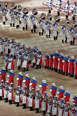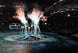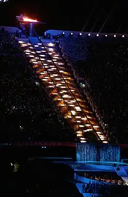 Veteran ceremonies director Ric Birch was the Director of Ceremonies[6] while David Atkins was the Artistic Director and Producer.[7] Its artistic section highlighted several aspects of Australian culture and history, showing Australia's flora and fauna, technology, multiculturalism, and the hopeful moment of reconciliation towards Aboriginal Australians.[6][8] The ceremony had a cast of 12,687 performers,[9] seen by a stadium audience of around 110,000.[8]