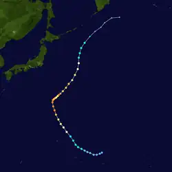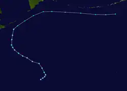 Tropical Depression 09W developed from an area of convection about 1,000 km (620 mi) to the east of Iwo Jima on July 21. Continued consolidation of its convection prompted both the JTWC to classify it as a tropical storm on 18:00 UTC.[27] The JMA followed suit six hours later and named it Kong-rey.[13] By July 23, the JTWC upgraded Kong-rey to a typhoon while the JMA upgraded it to a severe tropical storm.[13][11] A mid-latitude ridge to the east of Japan strengthened, causing Kong-rey to curve and move in a northeastward direction.[27] Kong-rey reached its peak intensity on July 25, then slightly weakened afterwards. At the same time, the JMA had finally upgraded Kong-rey to a typhoon.[13] On July 26, a redevelopment of a small eye caused Kong-rey to reach its second peak intensity for a short period of time. Its peak strength only maxed out to 10-minute sustained winds of 130 km/h (81 mph). Increasing wind shear caused the typhoon to weaken the next day. Kong-rey was downgraded to a tropical storm on 00:00 UTC of July 28.[27] Both agencies issued their final warning later that day when it had become extratropical.[13][11] Its remnants was still tracked until it reached the southwestern Aleutian Islands on August 3.[27]