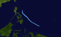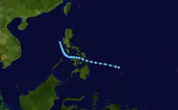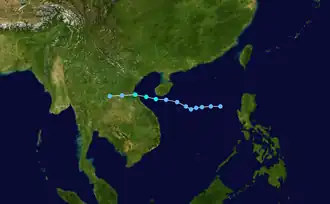 Utor spawned from an area of convection that developed off 907 km (565 mi) south-southeast of Guam on June 26, that remained quasi-stationary for 2 days before upgrading to a tropical depression on July 1 due to favorable conditions such as low vertical shear.[27] The depression strengthen into a tropical storm at 00:00 UTC on July 2.[13][27] Utor tracked west-northwest from a peripheral ridge and developed further, after entering the Philippine Area of Responsibility, and attained severe tropical storm status the following day. Utor was a large cyclone, with gale-force wind of 250 nmi (465 km; 290 mi).[11] Utor reached its peak strength on June 4, with 10-minute winds of 110 km/h (70 mph) and 1-minute winds of 150 km/h (95 mph), with the barometric pressure of 960 hPa (28 inHg).[13][11] Utor was centered 56 km (35 mi) near northern Luzon and tracked northwesterly as it began to weaken.[27] The storm made landfall near the east of Hong Kong on July 5 and quickly weakened before being last noted on July 7 by the JMA.[13]