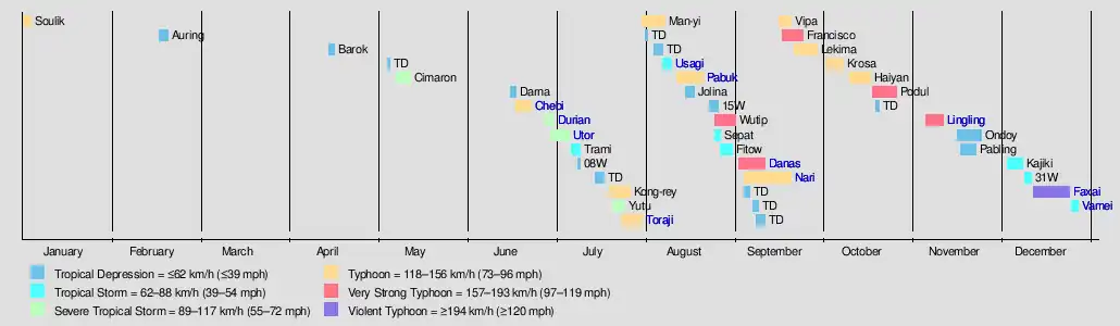 The early season was relatively inactive, with the first named storm, Cimaron, not developing until May 9. Taiwan suffered the most destruction from typhoons this year, with Typhoons Toraji, Nari, and Lekima being responsible for nearly 300 deaths in that island alone, making it one of the deadliest typhoon seasons in recorded history in that island. In November, Typhoon Lingling impacted the Philippines, killing 171 people, making it one of the deadliest Philippine storms this century. The season ended with the formation of Tropical Storm Vamei during the last week of December. Vamei would be notable for becoming the lowest latitude tropical storm, at 1.4°N, ever to be observed in the Northwest Pacific.