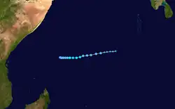 For several days in mid-December, tropical cyclone forecast models anticipated a storm to form to the south-west of Diego Garcia, which was proven true when an area of convection formed in that area,[7] becoming a tropical disturbance on December 21,[17] the fourth of the season. On December 23, MFR upgraded the disturbance to a tropical depression, and later that day to Tropical Storm Crystal. The storm moved southwestward toward Mauritius due to a ridge to the south-east.[7] Strengthening was gradual, and the JTWC upgraded Crystal to the equivalent of a minimal hurricane late on December 24.[17] The next day, an eye developed, although dry air initially prevented much further intensification.[7] MFR upgraded Crystal to tropical cyclone status on December 26,[17] and that day the cyclone passed just east of St. Brandon. Subsequently, Crystal intensified quickly after the eye became clearer,[7] reaching peak winds of 150 km/h (93 mph) on December 27.[17] Around that time, the storm passed east of Mauritius as it turned to the south while rounding the ridge.[7] After maintaining peak winds for about 18 hours, Crystal weakened,[17] gradually undergoing extratropical transition. The convection diminished over the center,[7] and Crystal weakened to tropical storm status on December 28.[17] The next day, the JTWC and MFR discontinued advisories, labeling the storm as extratropical.[7] The remnants continued to the south-east, dissipating on January 3 after crossing into the Australian region.[17]