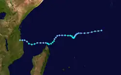 In late December, a tropical disturbance rapidly formed off the north-west coast of Madagascar. By late on December 30, MFR classified it as a tropical disturbance. The system quickly intensified while moving westward, becoming a strong tropical storm before hitting north-eastern Mozambique on December 31. Delfina weakened while moving inland, and it was no longer classifiable as a tropical cyclone by January 1.[7][18] However, its remnants moved across the country and into Malawi, later looping around and crossing back over Mozambique.[3] When the remnants reached the Mozambique Channel, they were reclassified as Tropical Disturbance 07, which moved southward over waters. It re-intensified into a tropical storm on January 8 before weakening the next day, becoming extratropical. The remnants persisted for several days, dissipating on January 14.[19][20]