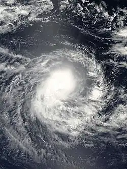 Late in the season in April, an area of convection formed south-west of Diego Garcia. It gradually organized, and there was a companion system to the west that also showed signs of development. The eastern system was declared Tropical Disturbance 16 on May 2, and with a ridge to the south-east it moved generally to the southwest. Early in its duration, the system affected St. Brandon and Mauritius with gusty winds. On May 4 it intensified into Tropical Storm Manou on May 4. After an initial strengthening phase, the storm weakened but later re-intensified as it approached Madagascar. Manou developed a well-defined eye and reached peak winds only 19 km (12 mi) from the eastern Madagascar coastline.[48] It reached tropical cyclone status, at the time only one of six in the month since 1968.[4] For about 12 hours, the cyclone stalled before turning to the south and weakening. After becoming extratropical on May 10, Manou dissipated three days later.[49][48]