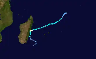On February 5, MFR began tracking a tropical disturbance to the east of Madagascar's northern coast. The system moved to the south-west before turning to the north on February 7.[30] By that day, the system had persistent convection around a weak circulation, located in an area of low wind shear. On February 8, the JTWC initiated advisories on Tropical Cyclone 16S, although initially the circulation was broad and exposed from the thunderstorms. The next day, MFR upgraded the depression to tropical storm status, and the Meteorological Services of Mauritius named the system Gerry. The storm turned to the south toward Mauritius and steadily intensified.[31] On February 12, the JTWC upgraded Gerry to the equivalent of a minimal hurricane, and shortly thereafter MFR upgraded the storm to a tropical cyclone.[30] Around that time, Gerry began undergoing rapid deepening, becoming an intense tropical cyclone early on February 13 while developing a well-defined eye and outflow. That day, the cyclone passed about 120 km (75 mi) east of Mauritius.[31] At that time, the JTWC estimated peak 1 minute winds of 195 km/h (121 mph), and MFR estimated peak 10 minute winds of 165 km/h (103 mph).[30] Subsequently, Gerry began weakening due to increasing wind shear, with the eye becoming disorganized. Later, the convection separated from the deepest convection,[31] and the cyclone weakened to tropical storm status on February 14.[30] The next day, JTWC discontinued advisories, and on February 16 MFR declared Jerry extratropical.[31] The remnants dissipated two days later.[30]