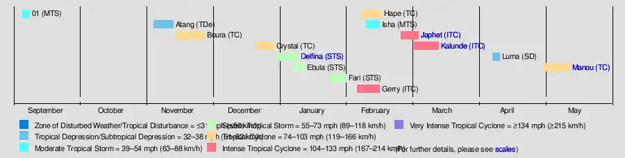 During the season, MFR issued advisories on 16 systems, of which 13 intensified to reach tropical storm force winds, meaning conditions were generally favorable for tropical cyclogenesis. The 13 systems with tropical storm force winds is only one short of the most such storms since the beginning of satellite-tracking in the 1967–68 season,[4] set in the 1993–94 season.[5] This is four more than the average of nine named storms.[6] In this season, there were 24 days on which tropical cyclones were active, slightly above normal, but only one storm—Kalunde—remained at that intensity for more than three days. By contrast, there were 68 days in which a tropical storm was active in the basin, which is 15 days above normal. The season began early and ended late; only four seasons began earlier and four ended later than this season since the start of satellite-coverage in the basin.[4]
