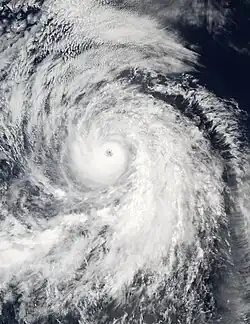 The storm continued to rapidly intensify and gradually developed a banding eye feature and infrared satellite images showed a possible eyewall in the central dense overcast.[34] After six more hours, a small eye had formed and Elida was upgraded to a high-end Category 2 hurricane on the Saffir-Simpson Hurricane Scale with 110 mph (180 km/h) winds on July 24, only eighteen hours after having first been initiated as a 35 mph (56 km/h) tropical depression.[35] Elida continued to rapidly strengthen, breaking the Dvorak estimates and reaching 135 mph (217 km/h) six hours afterward, making it a Category 4 hurricane and resulting in a rare forecast for the hurricane to reach Category 5 intensity.[36] The hurricane, moving at 16 mph (26 km/h), proceeded to make a west-northwestward turn while displaying an eye with an estimated diameter of 11 mi (18 km).[37] On July 25, Elida attained peak winds of 160 mph (260 km/h), making it a Category 5 hurricane. At the time, the NHC assessed a slightly lower peak as a high end Category 4.[38][31] At this time, Elida was observed to have formed concentric eyewalls, but it was not until the hurricane moved over cooler waters that the storm's eyewall replacement cycle was completed.[31] When the MERIS sensor aboard the European Space Agency's satellite Envisat observed and recorded Hurricane Elida at peak intensity, it was the first time that the instrument had observed a hurricane. The sensor was originally designed primarily for recording oceanic biology and water quality as well as land vegetation, clouds, and water vapor.[39]