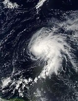 A tropical wave moved westward off the coast of Africa on July 14.[44] After tracking steadily westward, an area of thunderstorms became more concentrated as its upper-level environment became more favorable,[45] and late on July 19 the National Hurricane Center classified it as Tropical Depression Six while it was located about 1,035 miles (1,666 km) east of the Lesser Antilles.[44] Upon being classified as a tropical cyclone, the depression maintained two ill-defined hooking bands to its north and south, and was originally forecast to attain hurricane status before passing through the Lesser Antilles. With warm waters and very light wind shear forecast, its environmental conditions met four out of five parameters for rapid intensification.[46] Subsequently, convection diminished as the result of cold air inflow and instability from a disturbance to its southeast.[47]