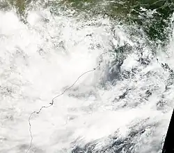 A low-pressure area persisted on October 4 in the western Bay of Bengal, off the east coast of Tamil Nadu. Two days later, the system organized into a depression and moved northward. Early on October 7, the depression made landfall at Kalingapatnam, Andhra Pradesh. After moving slowly northwestward over land, the system turned to the northeast, degenerating into a remnant low on October 10 over West Bengal.[1] The depression dropped heavy rainfall along its path, peaking at 380 mm (15 in) in Chandabali, Odisha. Kolkata received 267 mm (10.5 in), and rainfall spread as far northeast as Assam.[20] The rains caused widespread flooding across southeastern India, inundating 20 villages and covering 16,000 hectares (39,000 acres) of rice paddies. A tornado spawned by the depression injured 11 people and damaged several houses in Murshidabad. Across its track, the depression killed 13 people in West Bengal and another eight in Andhra Pradesh.[1]