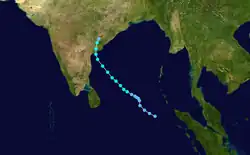 On December 10, an area of convection with an associated circulation persisted about 740 km (460 mi) west of the northern tip of Sumatra, as part of a trough in the region and enhanced by the monsoon. A steady decline in the wind shear allowed the thunderstorms to organize,[23] and a depression formed on December 11.[1] On the next day, the JTWC initiated advisories on Tropical Cyclone 03B. The storm moved generally northwestward, steered by a ridge to the north.[23] The IMD upgraded the system to a deep depression and later cyclonic storm on December 13, and further to a severe cyclonic storm a day later. The agency estimated peak winds of 100 km/h (60 mph), noting spiral convection organizing around the beginnings of an eye feature.[1] The storm also developed well-defined outflow due to an approaching trough from the west. At around 14:30 UTC on December 15, the storm made landfall near False Divi Point in southeastern India,[23] along the coast of Andhra Pradesh. After turning to the northeast over land, the system rapidly weakened, degenerating into a remnant low on December 16.[1]