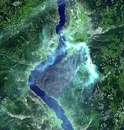 On August 16, 2003, at about 4 a.m. local time, a wildfire started via lightning strike near Rattlesnake Island in Okanagan Mountain Provincial Park, British Columbia, Canada. The wildfire was fuelled by a constant wind and the driest summer on record up to that time.[2] Within a few days it grew into a firestorm.