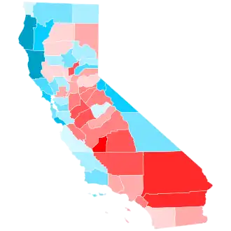 Bush remains the last Republican candidate to win San Diego, San Luis Obispo and Ventura counties in a presidential election. Fresno, Merced, Riverside, San Bernardino, San Joaquin, and Stanislaus counties would not vote Republican again until 2024. He is also the last candidate of any party to win Butte county by a majority. This is the last time the Democratic Party failed to obtain at least 60% of the vote until 2024.[9][10]