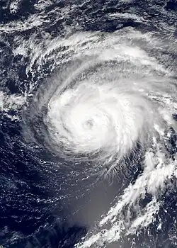 With 28 storms (27 named storms and one unnamed), the 2005 Atlantic hurricane season set a new single-year record for most storms, surpassing the total of 20 from 1933.[15] This record stood until surpassed by the 2020 season, which had 30 storms.[16] A total of 7 named storms formed before August 1, which exceeded the record of 5 set in 1997; this record stood until 2020. The fourth named storm developed at a then-record early date, surpassed in 2012. The fifth though eleventh and the thirteenth and onward named storms developed at then-record early dates that were later surpassed in 2020.[17] Further, the months of July and November set records for number of named storms, with 5 and 3, respectively. The 2005 season featured 15 hurricanes, surpassing the previous record of 12, set in 1969. Of the 15 hurricanes, 5 formed in September, with the season becoming only the sixth to feature 5 in that month.[17] The 2005 season also featured a record seven major hurricanes, one more than the previous record, set in 1926, 1933, 1950, 1996, and 2004. The four Category 5 hurricanes were also a record.[15][18] The season's activity was reflected with an ACE rating of 250, the second-highest value on record in the Atlantic basin, after the 1933 season.[19][20] The season would mark the end of a streak of three consecutive hyperactive seasons, beginning in 2003.