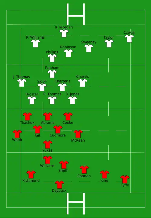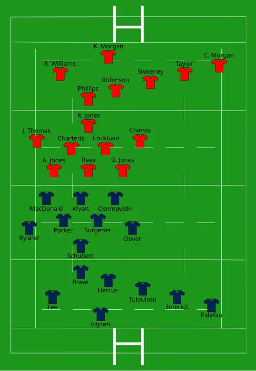 | Pen: Hercus | Report | Try: Sweeney C. Morgan N. Robinson K. Morgan J. Thomas R. Williams Charvis (2) Phillips Selley Pugh Con: Sweeney (11) |