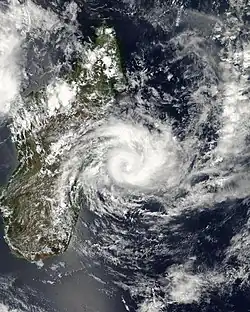 Most of the storms in the season occurred in the western portion of the basin.[6] From December 2006 to April 2007, a series of floods and storms affected Madagascar, including Bondo, Clovis, Favio, Gamede, Indlala, and Jaya;[8] this made it the most active season in the country since the 1999–2000 South-West Indian Ocean cyclone season.[6] The series of storms and floods left 10,000 families homeless, directly affecting 9% of the country's population. These floods left 336,470 people in emergency need of food,[8][9] after the storms destroyed 76,105 ha (188,060 acres) worth of crops.[10] The World Food Programme provided meals, distributed through non-governmental organizations and local officials. This covered the needs for these families until farmers were able to rebuild and regrow their food supply, using seeds provided by the Food and Agriculture Organization.[9] The Malagasy Red Cross provided more than 10,000 residents across the country with insecticide-treated mosquito nets.[11] The series of floods diminished the country's stock of supplies from United Nations agencies,[12] spurring a declaration of a national emergency,[13] and a nearly US$19.5 million appeal for international assistance. Countries around the world donated money or supplies to help the relief effort.[9] UNICEF distributed 100 freezers and refrigerators to health facilities that bore the consequences of the active season. The agency also provided the resources to rebuild or repair 95 schools.[14]