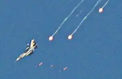 The second manipulated image was reported by the pseudonymous blogger "Dr. Rusty Shackleford" on his blog "The Jawa Report".[10][11] Reuters captioned it as showing an Israeli F-16 fighter jet firing ground-attack missiles "during an air strike on Nabatiyeh", but the F-16 was actually deploying one defensive flare, and the original photograph showed only one flare.[12][13] The photo had been doctored to increase the number of flares falling from the F-16 from one to three, and misidentified them as missiles.