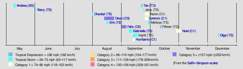 Tropical Storm Olga (2007)Hurricane NoelHurricane Lorenzo (2007)Tropical Depression Ten (2007)Hurricane Humberto (2007)Tropical Storm Gabrielle (2007)Hurricane FelixTropical Storm Erin (2007)Hurricane DeanTropical Storm Chantal (2007)Tropical Storm Barry (2007)Subtropical Storm Andrea (2007)Saffir–Simpson scale