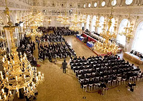 Klaus' chances to be reelected were boosted when Snítilý announced he would vote for Klaus prior to the session.[34] Surprisingly, in his address on 15 February 2008 before the joint session of parliament, Klaus stated he supported holding the presidential elections as public ballots and not as secret ballots as he demanded before.[35] Klaus also delivered a significantly more nationalistic and euroskeptical speech than the week previously. This was taken as an indication that he knew he had the votes to win and no longer needed to moderate his feelings.