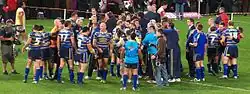 Leeds Rhinos leave the pitch victorious after progressing to the Superleague Grand Final.