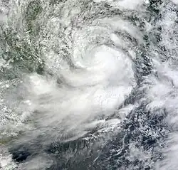 Early on September 3, the IMD reported that an area of low pressure had formed embedded within the monsoon off the Orissa coastline.[21] During the next day it developed further with the IMD reporting that the low-pressure area had become well marked with deep convection starting to consolidate around a developing low level circulation center in an area of moderate vertical wind shear.[22][23] Early on September 5, as the area of low pressure was moving into an area of low vertical windshear the JTWC issued a Tropical Cyclone Formation Alert, whilst the IMD reported that the low-pressure area had intensified into a Depression.[24][25] Later that day the IMD reported that the depression had intensified further and had become a Deep Depression, whilst the JTWC designated the depression as a Cyclone 03B, with winds equivalent to a tropical storm.[26][27] However the JTWC's first warning was also their final warning as the cyclone had made landfall near Digha in West Bengal and was expected to dissipate later that day.[27][28] However the IMD kept issuing advisories on the deep depression until early on September 7, when the IMD reported that it had weakened into a depression and then into a well marked low-pressure area later that day when they stopped issuing advisories on the depression whilst it was located over Jharkhand and adjoining region of Chhattisgarh.