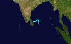 On December 10, RSMC New Delhi announced that Depression BOB 05 had formed, about 400 km east-southeast of Batticaloa, Sri Lanka.[31] The next day it strengthened to become Cyclonic Storm Ward.[32] After wandering some time to the east of Sri Lanka, the system made landfall near Trincomalee on December 14 as a Deep Depression.[33] Cyclonic Storm Ward dissipated completely on December 16. Sirkali in Tamil Nadu recorded 140 mm of rainfall on 15 December. Maximum winds of 25 knots (46 km/h) was reported at the Pamban observatory in coastal Tamil Nadu.[14]