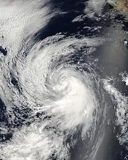 Hurricane Guillermo formed on August 12 from a broad area of low pressure nearly 700 miles (1,100 km) SW of Baja California. The system developed a good series of banding features and convection, and as a result, in the afternoon later that day, it strengthened into a tropical storm, the seventh in the eastern Pacific that year. On August 14, it strengthened to become the fourth hurricane of the season, concurrent to the development of a good, banding type eye. That afternoon, Guillermo strengthened to a Category 2 hurricane with maximum winds increasing to 100 mph (160 km/h). Early on August 15, Guillermo intensified to become the second major hurricane of the season, as it was upgraded by the NHC to a Category 3 hurricane, with maximum winds increasing to 125 mph (201 km/h). On August 16 it crossed into the Central Pacific basin as a Category 1 hurricane, and then quickly weakened to a tropical storm thereafter due to very high wind shear. Despite over very strong as high as 45 mph (72 km/h) of shear, Guillermo survived as a weak tropical storm for a further 3 days before weakening to a depression and degenerating to a remnant low on August 19, near the West Coast. However, the remnants continued to curve towards the northeast for the next several days, before finally dissipating on August 23.[47]