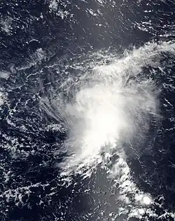 A tropical wave exited the western coast of Africa on June 19, which moved westward across the Atlantic without development. By June 29, the wave crossed Central America into the eastern Pacific. Thunderstorms increased over the next several days, which organized into curved rainbands around a developing low-pressure area on July 4. Following further organization, the system developed into a tropical depression on July 6, located roughly 435 miles (700 kilometres) south of Cabo San Lucas, Mexico. Soon after, it strengthened into Tropical Storm Blanca.[25] Operationally, the NHC classified the system immediately as a tropical storm. At that time, Blanca developed an eye-feature, though it was not expected to develop into a hurricane.[26] Steered by a ridge to the north, the storm moved west-northwestward throughout its existence.[25] Early on July 7, Blanca attained peak winds of 50 mph (80 km/h) and a barometric pressure of 998 mbar (hPa; 29.47 inHg).[25] The storm's convection developed into a central dense overcast over the center,[27] which soon began deteriorating, with cloud tops warming and convection shrinking.[28] By late on July 7, the center became devoid of shower and thunderstorm activity,[29] with only intermittent convection.[30] On July 8, Blanca weakened into a tropical depression, and the next day it degenerated into a remnant low. Although no longer a tropical cyclone, the remnants of Blanca maintained a well-defined low pressure center as it continued its northwesterly movement. Early on July 11, the system turned northward and gradually weakened. By the following day, Blanca had dissipated over open waters.[25]