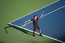 Federer began his US Open campaign well with a victory over unseeded Devin Britton.[18] He advanced to the third round with a second-round win over Simon Greul.[19] His third-round match was against Hewitt, against whom he lost his first set of the tournament, but eventually rallied to win the match.[20] After this match, Federer held a 16–7 lead over Hewitt, continuing a fourteen match winning streak against him.[21] Federer next defeated Tommy Robredo to book a quarterfinal berth against Robin Söderling for the third Grand Slam in a row, which he won in four sets after saving a set point in the fourth set.[22] Federer reached his 21st Grand Slam final by defeating fourth seed Novak Djokovic for the third straight year. He triumphed and, in doing so, reached match point by performing a between-the-legs passing shot, which he later described as "...the greatest shot I ever hit in my life."[23] He lost to del Potro in the final in five sets.[24] The loss broke Federer's streak of forty consecutive wins at the US Open. It also marked the first time Federer had lost in a Grand Slam final to an opponent other than Rafael Nadal.[25]