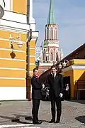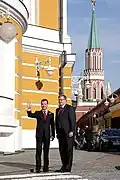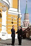 Chinese leader Hu Jintao confirmed his attendance at the parade on 3 May. The following day Slovak President Ivan Gašparovič's attendance was confirmed.[7] Other world leaders who confirmed their attendance included Czech President Václav Klaus,[8] French President Nicolas Sarkozy,[8] Italian Prime Minister Silvio Berlusconi,[8] Serbian President Boris Tadić,[9] Bulgarian President Georgi Parvanov,[10] and Vietnamese President Nguyễn Minh Triết,[11] Leaders from Armenia, Azerbaijan, Estonia, Greece, Israel, Kazakhstan, Latvia, Mongolia and Slovenia also confirmed their attendance.[9] On 8 May, Sarkozy and Berlusconi announced that they wouldn't be attending the parade in Moscow, so that they could deal with the euro area crisis.[12][13]