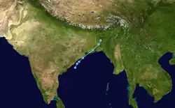 On October 7, the India Meteorological Department (IMD) upgraded an area of low pressure to a depression, giving it the designation "BOB 02". At that time, the depression was located approximately 180 km (110 mi) southeast of Visakhapatnam.[20] Later that day, the IMD reported that the system was 120 kilometres (75 mi) east of Visakhapatnam.[21] On the same day, the IMD reported that the system moved away from Visakhapatnam and maintained strength. The system was forecast to make landfall between Gopalpur and Paradip overnight but the depression made landfall over Paradip late on October 7 instead.[22] On October 8, the IMD reported that the system had weakened slightly.[23] Later on that day, the IMD reported that the depression had further weakened.[24] The storm made its second landfall at Kolkata, West Bengal, India.[25] Signal 3 cyclone alert was issued at the Maritime ports of Chittagong, Cox's Bazar and Mongla.[26] The Depression continued to weaken as it moved northwest until it was caught up in the jet stream and completely absorbed by a non-tropical storm early on October 9.[27]