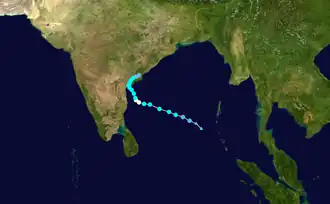 In early December, a low-pressure area formed over the Bay of Bengal. The low-pressure area moved towards the Indian coast and became more well marked. On December 7, the India Meteorological Department (IMD) upgraded the area of low pressure to a depression giving it the designation "BOB 06". At that time it was located approximately 450 kilometres (280 mi) south-southwest of Visakhapatnam, Andhra Pradesh, India.[73] Until December 8, the depression moved northwestwards and made landfall at Bapatla, Andhra Pradesh, India where it dissipated into a remnant low soon after the landfall.[74][75]