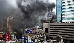 Ratchaprasong was surrounded with armoured vehicles and snipers in the days leading to 13 May.[15] On the evening of 13 May, Khattiya Sawasdiphol ("Seh Daeng"), a popular security adviser to the protesters, was shot in the head by a sniper's bullet while he was giving an interview to The New York Times. The state of emergency, already in place in Bangkok, was expanded to 17 provinces and the military commended an extended crackdown, leading to an additional 41 civilian deaths (including an Italian photographer) and more than 250 injuries by 8:30 pm on 18 May.[16] One military death occurred due to friendly fire.[17] The military claimed that all civilians killed were either armed terrorists or civilians shot by terrorists, and noted that some civilians were shot by terrorists disguised in army uniforms.[18] The military declared the area a "live fire zone", and medics were banned from entering.[4][19][20][21] On 16 May, UDD leaders said they were ready for talks as long as the military pulled back, but the government demanded the protesters' unconditional dispersal.[22] The government rejected a Senate call for a ceasefire and Senate-mediated negotiations. On 17 May, Amnesty International called for the military to stop using live ammunition.[23] Armored vehicles led the final assault into Ratchaprasong in the early morning of 19 May, killing at least five.[24] Soldiers were reported to have fired on medical staff who went to the aid of shooting victims.[24] By 1:30 pm, UDD leaders surrendered to police and told protesters to disperse. Dozens of arson attacks broke out nationwide. A curfew was declared and troops were authorized to shoot on sight anybody inciting unrest.[24]