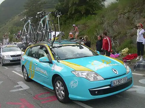 The Astana team car driving up the Alpe d'Huez during stage 19 of the 2011 Tour de France.