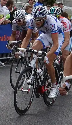 Three days later, Rollin finished tenth in Dwars door Vlaanderen.[32] Bonnet finished sixth in the succeeding E3 Prijs Vlaanderen – Harelbeke three days later,[33] after making his way into the breakaway, with Chainel also making it into a secondary breakaway from the main field after pressure from the Garmin–Cervélo squad. He eventually finished the race 15th.[33] At the beginning of April, Meersman earned his second runner-up placing in the space of three weeks, finishing behind Renaud Dion (Bretagne–Schuller) in Route Adélie; Meersman had been one of seven riders in contention for victory in a breakaway in the closing stages.[34][35] Meersman followed up that performance two days later, in the inaugural Flèche d'Emeraude, by finishing fourth in the final mass sprint.[34] Hutarovich finished third in the Scheldeprijs three days later,[36] having avoided a crash in the finishing straight which eliminated several riders from contention for the top placings. Casar won Paris–Camembert later in April, by making a late ten-rider selection which included teammate Fédrigo, who worked to set Casar up for a sprint on the uphill finish. Casar was easily the strongest, ahead of Romain Hardy and Julien Antomarchi.[37]