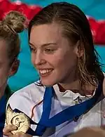 On the seventh day of competition on July 30, six finals were contested, the women's 50 m butterfly, men's 50 m freestyle, women's 200 m backstroke, men's 100 m butterfly, women's 800 m freestyle, and the women's 4×100 m medley relay. In the first final of day seven, the women's 50 m butterfly, Dutch swimmer Inge Dekker pulled an upset and won the gold ahead world record holder Therese Alshammar 25.71 to 25.76.[26] In the men's 50 m freestyle, Brazilian César Cielo successfully defended his 2009 title with a win in a time of 21.52.[27] In the women's 200 m backstroke, American Missy Franklin dominated the competition with a national record time of 2:05.10, almost a second ahead of second-place finisher Belinda Hocking and nearly breaking the world record set in 2009.[28] Franklin's time of 2:05.10 is the third-fastest ever in the event. In the men's 100 m butterfly, American Michael Phelps won the expected gold in a time of 50.71, his third consecutive title in the event (also winning in 2007 and 2009) and second individual title of the meet.[29] In the women's 800 m freestyle, Brit Rebecca Adlington was able to hold off Dane Lotte Friis for the win with a time of 8:17.51. Friis finished second with a time of 8:18.20.[30] In the final event of day seven, the women's 4×100 m medley relay, the American team of Natalie Coughlin, Rebecca Soni, Dana Vollmer, and Missy Franklin won the gold with a time of 3:52.36, over three seconds ahead of second-place finisher China. Their time was the second-fastest of all time and was just outside the Chinese owned world record of 3:52.19 from 2009. It was the first title for the American team since 1998. Notably, Franklin, who had just completed the 200 m backstroke, completed the freestyle leg in the medley relay in 52.79, the fastest freestyle leg in the field.[31] No new world or competition records were set during day seven.