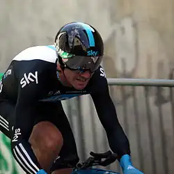 Shortly after the Tour de France, Urán finished within the lead group at the Clásica de San Sebastián, where he placed ninth.[22] In August, Boasson Hagen tasted success in Germany, by winning the Vattenfall Cyclassics; Boasson Hagen attacked from 250 metres (820 ft) out,[23] and held off Gerald Ciolek, who took second place for Quick-Step, while Borut Božič completed the podium for Vacansoleil–DCM.[24] The following week, at the GP Ouest-France, Gerrans finished second behind Lampre–ISD's Grega Bole, after Bole had attacked the field within the final 2 kilometres (1.2 mi) of the race.[25] For the Grand Prix Cycliste de Québec, Sky looked to control the race in order to protect Urán, Gerrans and Boasson Hagen.[26] Urán did eventually feature in the race's closing stages; he made it into a ten-man lead group, and when Rabobank's Robert Gesink attacked with 5 kilometres (3.1 mi) left, Urán went with him but both riders were closed down quickly. Philippe Gilbert then attacked the group again and eventually beat Gesink to the line, with Urán completing the podium, nine seconds behind the pair.[27] In October, Gerrans and Nordhaug both took top ten placements in the Coppa Sabatini race in Tuscany, which also saw Urán make an error by mistakenly believing that he had won the race, when there was still another lap of the circuit to be completed.[28] The same day, in France, Hayman won the Paris–Bourges event in a sprint finish, having been in a breakaway from 15 kilometres (9.3 mi) into the 190.4 kilometres (118.3 mi) race.[29] Two other Team Sky riders finished in the top ten, as Henderson finished third behind Saxo Bank–SunGard rider Baden Cooke, while Sutton finished in tenth position, the last rider to finish in the same time as Hayman, who claimed his first victory since the 2006 Commonwealth Games.[30] Urán took another third-place finish, in the Giro dell'Emilia, coming home in a group of four riders, over 20 seconds behind race-winner Carlos Betancur of Acqua & Sapone.[31] The next day, at Paris–Tours, Stannard made several aggressive attacks before the race had reached Tours, but could not react to a joint move by Marco Marcato of Vacansoleil–DCM and BMC Racing Team rider Greg Van Avermaet, who contested the top two places at the finish. Stannard attacked in the final 2 kilometres (1.2 mi) but could only finish fourth in the end, just behind Saxo Bank–SunGard's Kasper Klostergaard.[32] The team's year was concluded by a tenth-place finish by Löfkvist at the Giro del Piemonte,[33] and third-place finishes for Dowsett at the Chrono des Nations,[34] and Sutton at the Noosa Grand Prix.[35] The team also sent squads to the Grand Prix Cycliste de Montréal, the Gran Premio Bruno Beghelli, and the Giro di Lombardia, but placed no higher than 15th in any of these races.