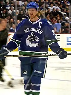 In his first game as a Canuck, Roy tallied an assist helping Vancouver to a 4–0 win. The win moved the Canucks past Minnesota for the division lead.[108] The shutout marked Schneider's fourth of the season, which doubled his career total.[109] Two games later, Schneider registered his fifth shutout of the season in a 2–0 over the Coyotes, tying him for the League lead. The game also marked the return of Kesler, who scored the game-winning goal.[110] Minnesota slumped towards the end of the season and the Canucks won their fifth-straight Northwest Division title with a 2–1 victory over the Blackhawks.[111] In the game, Schneider suffered a groin injury and was unable to play the last two games of the season; he was listed by the Canucks as day-to-day with a "body" injury.[112][113][114] With Schneider out, the Canucks lost their final two regular season games. In their final loss, Vigneault rested many of his regulars, though he received criticism for playing Henrik Sedin for only 22 seconds. Furthermore, Sedin left the bench after his one shift. The Los Angeles Times' Helene Elliott called it a cheap way of keeping Sedin's ironman streak intact. For his part, Henrik Sedin told Vigneault that "he would be okay with sitting out the game" and to him the streak is just "a number in the paper." Vigneault responded by telling Sedin that "he's not going to be the one that breaks the streak," and he gave him the choice to remain on the bench or return to the locker room. Sedin felt remaining on the bench would have been a further distraction and chose to leave.[115][116] By season's end, the Sedin twins' point production dropped from the previous years. Henrik's point points-per-game average was the lowest it had been since 2007–08, while Daniel's was his worst since 2003–04.[117][118] The Cauncks' power play also struggled throughout the year dropping from fourth in 2011–12 to 23rd in the League.[119][120]