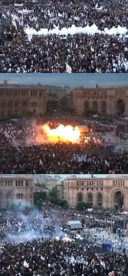 On 4 May the last official day of the campaign, during the Republican Party concert and rally in Republic Square of Yerevan, dozens of balloons filled with hydrogen exploded, resulting in the injury of at least 144 people according to the Ministry of Emergency Situations.[17] A few hours later it was reported that out of total 154 people hospitalized, 98 were still in hospitals and 28 were in intensive-care units.[18]