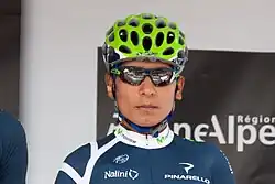 After a period of stability within the main group, a four-rider move consisting of three French riders – David Moncoutié representing Cofidis, Blel Kadri of Ag2r–La Mondiale and Team Europcar's Christophe Kern, who won a stage during the 2011 race – as well as Colombia's Cayetano Sarmiento, riding for the Liquigas–Cannondale team, advanced clear of the field and quickly established an advantage over them; of those, Kadri was best-placed at just eleven seconds behind Wiggins prior to the stage.[34] Team Sky marshalled the front of the peloton as a result, not letting the gap over four minutes at any point. Behind, there were several moves in order for riders to bridge a gap between the main field and the leaders; at the Col de Lalouvesc with 40 km (24.9 mi) to go, the leaders only held a gap of around half a minute over their chasers.[35] Five riders tried to do so, but only one was able to stay in between the breakaway and the peloton.