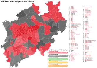 The 2012 North Rhine-Westphalia state election was held on 13 May 2012 to elect the members of the Landtag of North Rhine-Westphalia. The incumbent minority government of the Social Democratic Party (SPD) and The Greens led by Minister-President Hannelore Kraft was returned with a majority and continued in office. The seat count drastically increased from 181 in the previous election to 237.