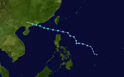 Late on June 7, a tropical disturbance formed south-southeast of Pohnpei.[92] By the next day, the Joint Typhoon Warning Center (JTWC) issued a Tropical Cyclone Formation Alert on the system, but cancelled it late on June 9.[93][94] The JMA upgraded the low-pressure area to a tropical depression early on June 11, with the JTWC subsequently following suit.[95][96] Early on the next day, the JTWC upgraded the system to a tropical storm, and later the JMA also upgraded it to a tropical storm and named it Guchol.[97][98] Early on June 14, the JMA upgraded Guchol to a severe tropical storm, and the PAGASA assigned the local name Butchoy on the system as it entered the Philippine Area of Responsibility.[99][100] Later that day, the JTWC upgraded Guchol to a category 1 typhoon, as convection started to organize.[101] It continued to intensify into a category 2 typhoon on June 15, as it became better organized and started to develop more convection.[102] As Guchol went through rapid intensification with a well defined eye on June 16, the JMA upgraded it to a typhoon early that day, and the JTWC upgraded it further to a category 3 typhoon, and later a category 4 super typhoon.[103][104][105] Guchol reached peak intensity late on June 17,[106] before it began to undergo an eyewall replacement cycle as the storm weakened under moderate vertical wind shear on June 18,[107] and later started its extratropical transition. The JTWC downgraded Guchol to a tropical storm on June 19, as it made landfall over Kii Peninsula in Japan.[108] Later that day, the JMA downgraded Guchol to a severe tropical storm, as it traversed Japan.[109] On June 20, the JMA issued their last advisories on Guchol, as it fully transitioned into an extratropical cyclone northeast of Japan.[110]