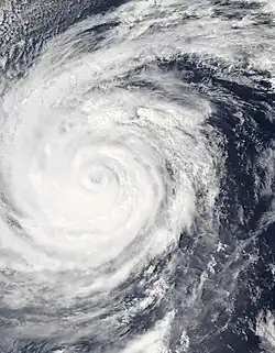 With warm sea surface temperatures and decreasing wind shear, Mawar developed a central dense overcast.[73] This led to the JMA upgrading Mawar to a severe tropical storm on June 2.[74] The JTWC subsequently upgraded it to a Category 1 typhoon as a developing eye feature was seen on microwave imagery.[75] Turning northeastward as a mid-latitude trough weakened the subtropical ridge to the northeast, Mawar further intensified into a Category 2 typhoon early on the next day, as a ragged eye became visible on satellite imagery.[76] The JMA followed suit and upgraded Mawar to a typhoon later that same day.[77] By June 4, Mawar reached its peak intensity,[78][79] before it started to weaken due to the mid-latitudes impacting the system's overall structure, with its eye breaking down into tight spiral banding, prompting the JTWC to downgrade the system to a category 2 typhoon.[80] On the next day, the PAGASA issued their final advisory on Mawar, as it was exiting the Philippine Area of Responsibility.[81] Mawar further weakened into a category 1 typhoon as its low-level circulation center widened, and was entering a hostile environment due to its interaction with the jet stream.[82] The JMA subsequently downgraded Mawar to a severe tropical storm,[83] as it commenced its extratropical transition.[84] Late on the same day, the JTWC issued their final advisory on Mawar, as it was deeply embedded in the baroclinic zone and its low-level circulation center had decoupled behind its convection.[85] On June 6, Mawar fully became an extratropical cyclone, and the JMA issued their final advisory on the system.[86] The system was last noted east of the Kamchatka Peninsula on June 13.[87]