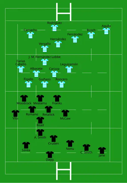| Try: Fernández 16' c Con: Rodríguez (1/1) 17' Pen: Rodríguez (3/5) 11', 35', 50' | Report[12] | Try: F. Steyn 64' c Con: M. Steyn (1/1) 65' Pen: M. Steyn (3/7) 32', 48', 53' |