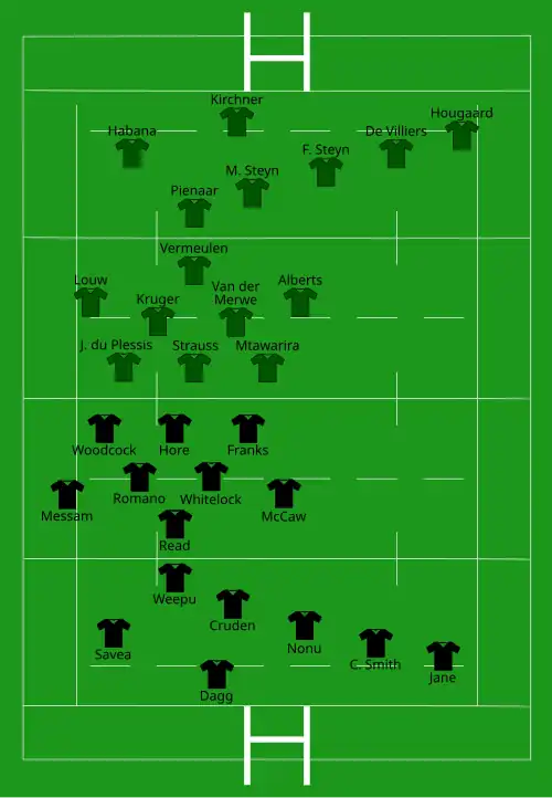 | Try: Dagg 19' m A. Smith 60' c Con: Cruden (1/2) 60' Pen: Cruden (3/5) 52', 75', 82' | Report[16] | Try: Habana 48' m Pen: M. Steyn (1/4) 18' Goosen (1/2) 70' |