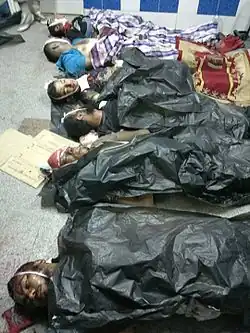 Ensuing protests in favour of Morsi were violently suppressed culminating with the dispersal and massacre of pro-Morsi sit-ins on 14 August 2013, amid ongoing unrest; journalists[27] and several hundred protestors were killed by police and military force. Muslim Brotherhood members claim 2,600 people were killed.[28] Human Rights Watch documented a minimum of 904 deaths, describing it as crimes against humanity and "one of the world's largest killings of demonstrators in a single day in recent history," while the government puts the figure at 624.[29][6]