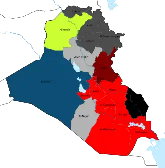 Governorate or provincial elections were held in Iraq on 20 April 2013, to replace the local councils in the governorates of Iraq that were elected in the Iraqi governorate elections of 2009.[1] Elections took place in 12 of Iraq's 18 governorates. Elections didn't take place in the 3 governorates forming the Kurdistan Region[2][3] or Kirkuk, Anbar, or Nineveh, meaning that a total of 378 provincial council seats were up for election.[4][5]