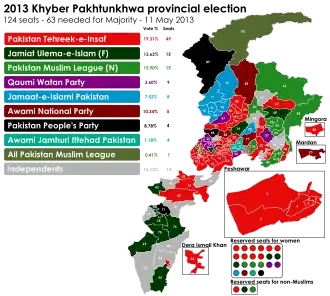 Following the elections, Pakistan Tehreek-e-Insaf formed a coalition government with Jamaat-e-Islami and the Qaumi Watan Party, giving them 15 extra seats.[8] As well as this, 9 out of the 14 independents elected joined PTI, giving them a comfortable majority in the assembly.[9]
