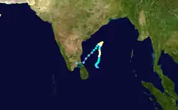 On November 8, the remnants of Tropical Depression 30W (Wilma) crossed the Malay Peninsula, and emerged into the eastern Bay of Bengal.[52] During the next several days, the system drifted towards the west while weakening further. On November 12, the system began to reorganize gradually, while continuing to move westwards. On November 13, the system was classified as a depression by the IMD, and given the identifier BOB 05.[53] The depression maintained its intensity despite passing through an environment unfavorable for intensification, and was re-upgraded to tropical cyclone intensity by the JTWC on November 15.[54] Shortly before landfall, the system weakened due to land interaction, and the JTWC issued its final warning.[55] On November 16, BOB 05 made landfall near Nagapattinam, Tamil Nadu, and the system quickly began to weaken. Later on November 16, the IMD issued its final advisory on Depression BOB 05, as the system weakened into a well-marked area of low pressure.[56] Over the next several hours, the remnant low of BOB 05 moved across the central part of Southern India, and the system continued to weaken. During the next several days, BOB 05 moved westwards across the Arabian Sea as a convectionless low. Later, the remnants of BOB 05 redeveloped a small amount of convection, while continuing to moved westwards. Late on November 21, the remnants of BOB 05 turned to the southwest, affecting Socotra Island on November 22. Early on November 23, the remnants of Depression BOB 05 dissipated just south of Socotra Island.
