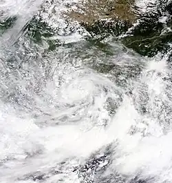 The storm slowly drifted west-northwestward while deep convection consolidated around the system's well-defined center of circulation.[63] In the early hours of November 20, the IMD classified BOB 06 as a Cyclonic Storm, thereby officially naming it Helen.[64] Helen continued to intensify into a Severe Cyclonic Storm the following day, reaching its peak intensity of 100 km/h (62 mph) with a central pressure of 990 mbar (29 inHg). Shortly before landfall, the storm's convection sheared to the north, causing its low level circulation to fully expose followed by the JTWC issuing its final bulletin, reporting that the storm had weakened due to land interaction.[65] Helen made landfall south of Machilipatnam, Andhra Pradesh and rapidly deteriorated into a deep depression.[66][67] It was last noted as a low-pressure area on November 23. A total of 11 deaths were reported in incidents related to the cyclone.[68][69]